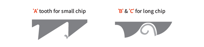 Remember that ‘A’ & ‘AW’ have small gullets so work best with small-chip materials, ‘B’ or ‘C’ style teeth have larger, rounded gullets and are for long-chip materials.
