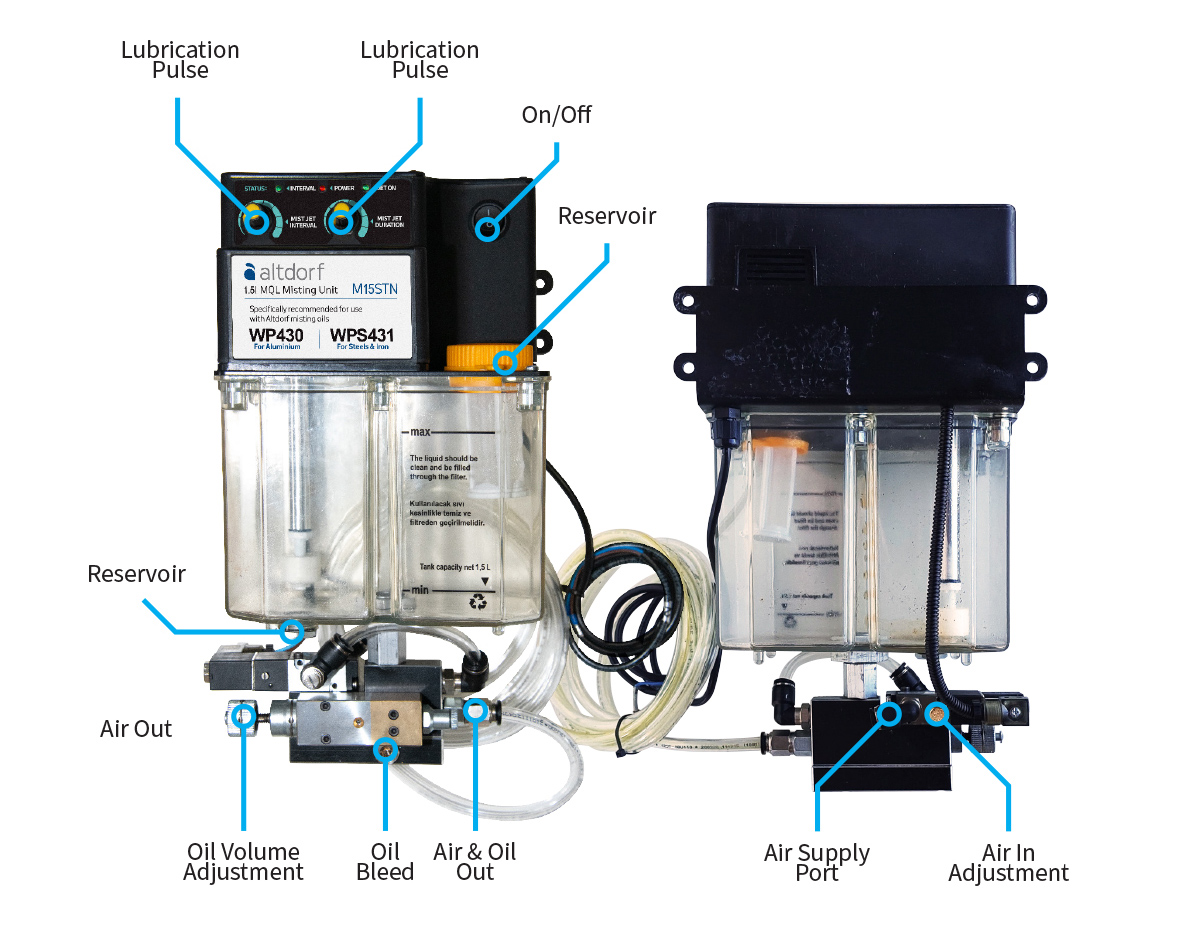 Each system comes with the appropriate nozzle for your machine/process, which will need to be positioned so that it sprays oil right where needed, i.e. directly before the actual metal removal occurs. In this way, the minimum amount of oil required is drawn straight into the cutting zone and none is wasted – hence the term Minimum Quantity Lubrication, or MQL, often being applied to misting systems.