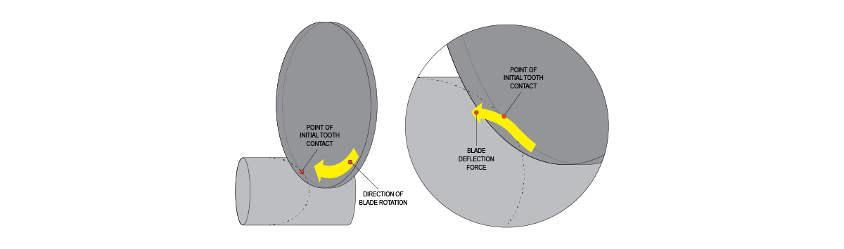 When cutting angles, if the blade’s first touch point is the highest part of the round, no problem. But the further away from the top of the round the blade first makes contact, the more it will start the cut on just one corner of the blade, instead of touching square-on across the full width of the tooth.